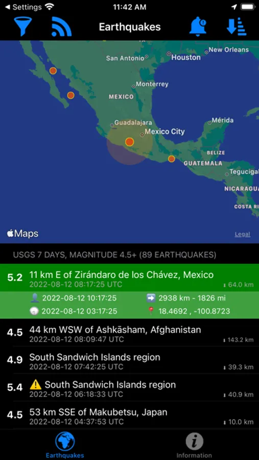 This section allows you to see the seismic activity around the world. It is connected with the USGS and EMSC database to always retrieve the most current data.