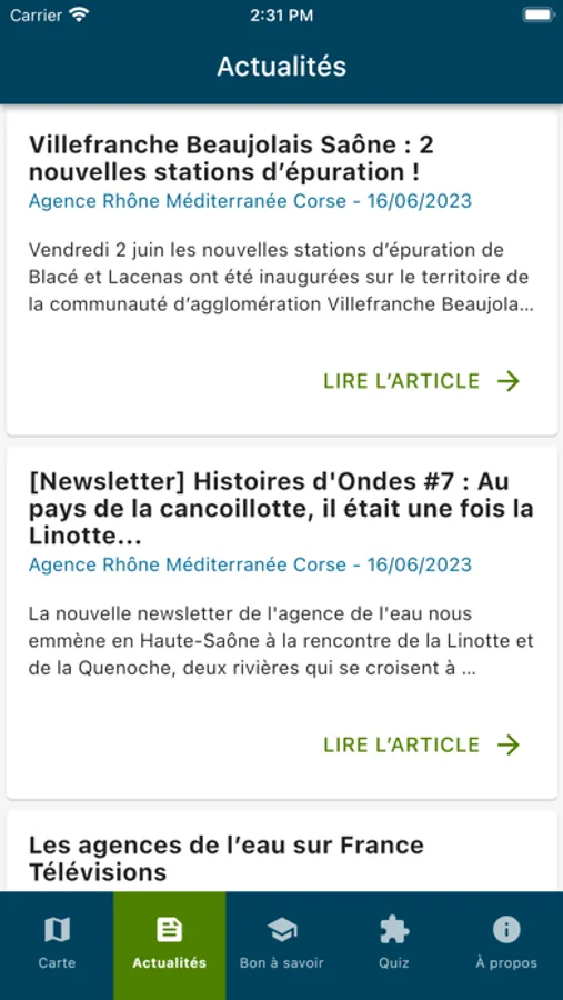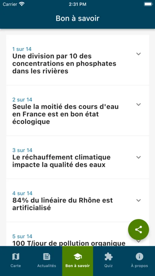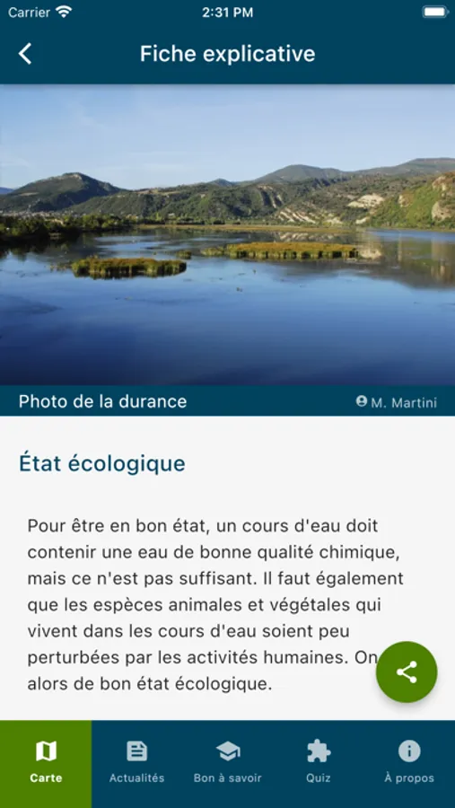 L’application s’adresse à tous les publics et propose des jeux et quiz pour tester ses connaissances sur l’eau, ou encore connaître les comportements à éviter. La qualité des cours d’eau peut aussi être comparée sur 3 ans permettant ainsi de voir les efforts accomplis par les acteurs des territoires pour restaurer les rivières et éliminer les pollutions.