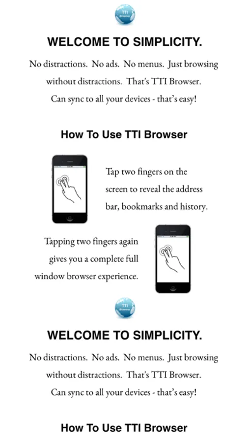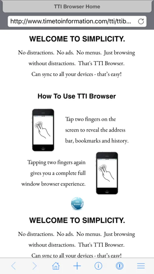 TTI Browser is a full page browser experience. The toolbar is hidden from view until you tap two fingers on the page to reveal it.