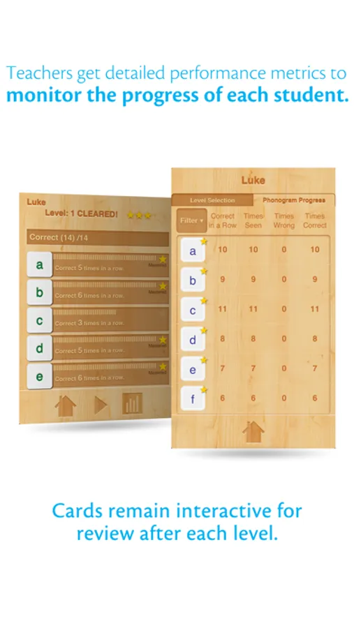 - After a phonogram has been correctly answered five times, a star is placed on the card in the selection screen to indicate mastery.