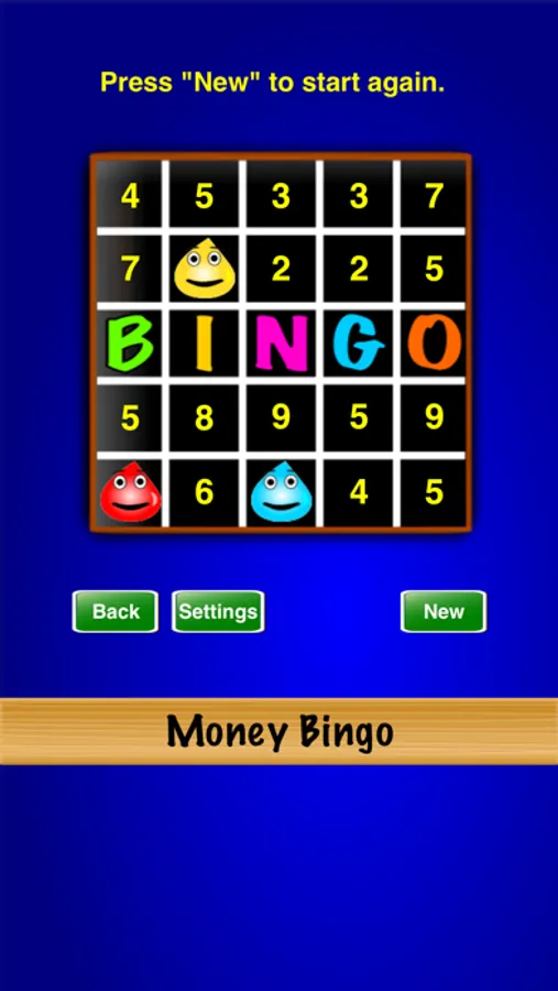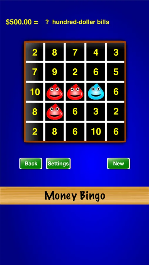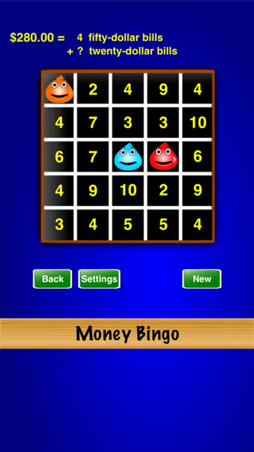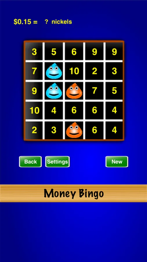 Money Bingo is a great money math game for the whole family. Select the test mode, difficulty level, and background in the "Settings" screen. Progress through the test modes and difficulty levels until you master the game.