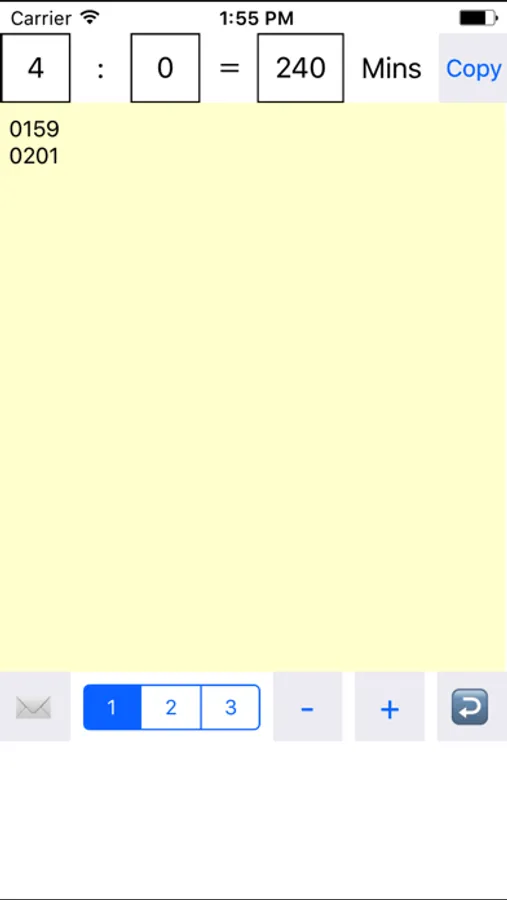 Total time(hour and minutes) and minutes of the number of newline-delimited text(HHMM). Compute time(H:M) from minutes.