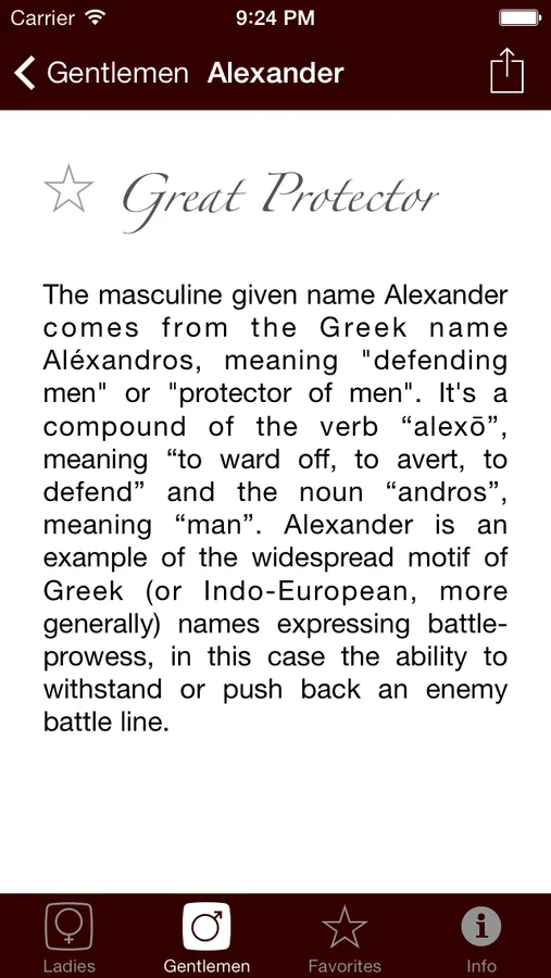 Use its built in search and index features to quickly learn the meaning of a name, save it as a favorite, share it with your friends on Facebook or Twitter or send it by E-mail, all in the blink of an eye.