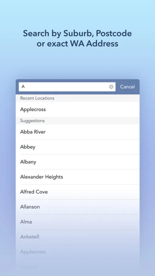 • Fast Search auto completion and location information for majority of suburbs & postcodes in Western Australia (suburbs which may have stations nearby, not just ones that have petrol stations in them)