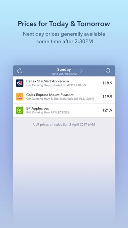 • Easily swipe to reveal tomorrow's prices (when available, usually some time after 2:30PM Australian Western Standard Time)