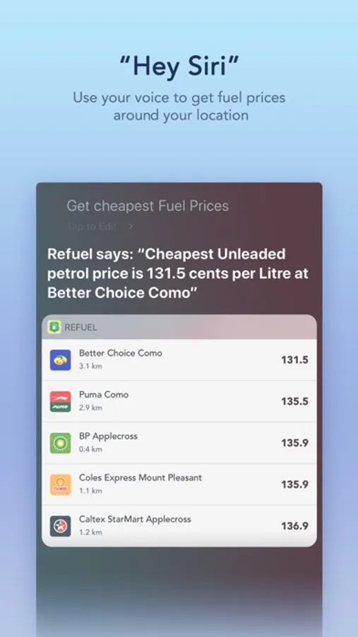 • "Hey Siri", with Siri Shortcuts you can ask Siri for the cheapest or nearest fuel prices around you just by using your voice