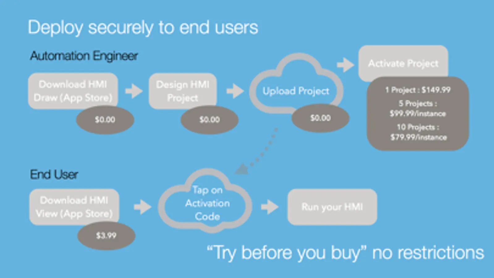 HMI Draw allows you to create efficient, advanced, highly responsive "Human Machine Interfaces" right on your iPad screen with unprecedented ease of use and fun. The HMI Draw app is fully native and supports all major Programmable Logic Controller (PLC) brands. For the price of the app (FREE) you can *fully* develop and test projects of any complexity. No restrictions on number of pages, tags or PLCs are applied at this stage. You only pay for project activations when you are ready to deploy to end users.