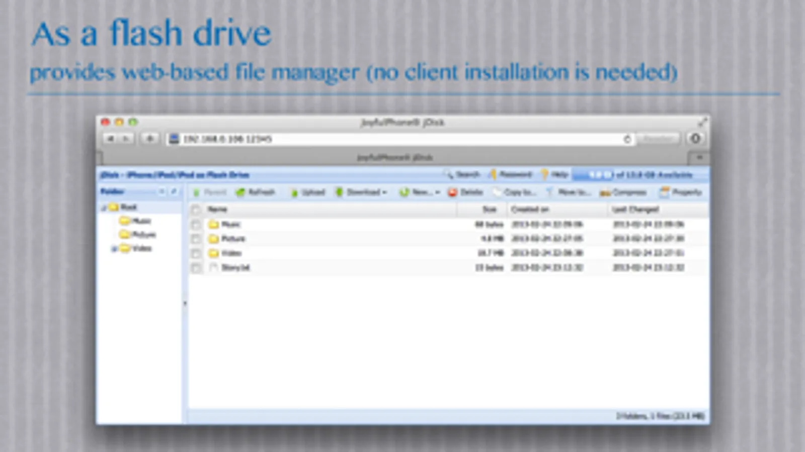 jDisk turns your iPhone/iPad/iPod into a flash drive / disk. jDisk provides a purely web-based management UI, what you need do is visit it in your browser, no client installation is needed.