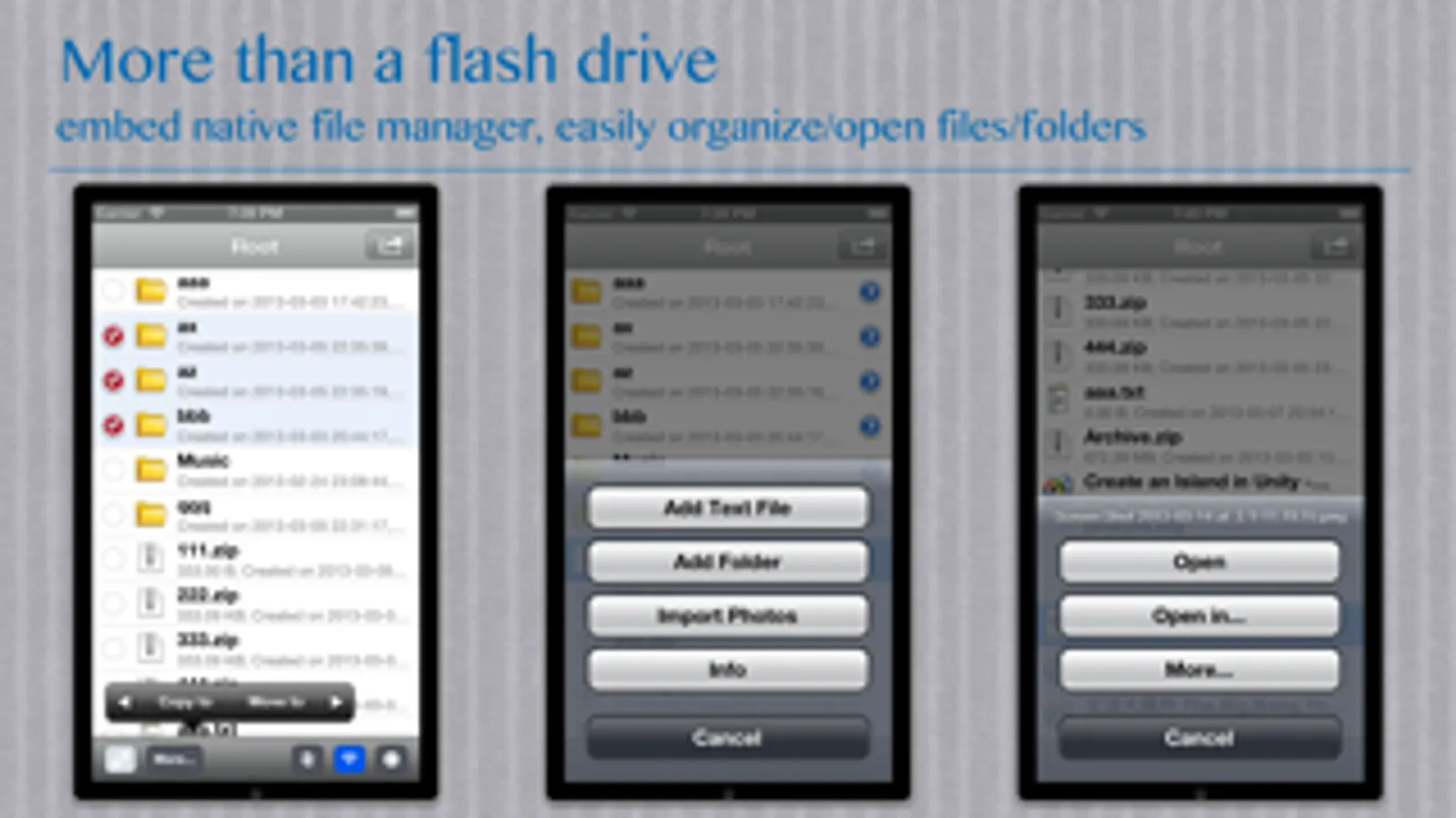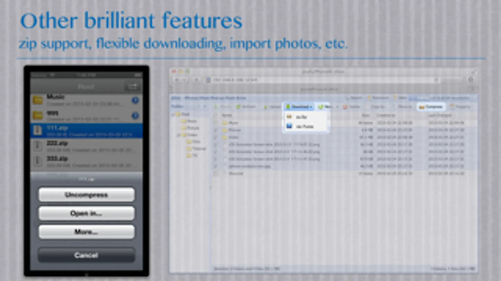 - flexibly download files from your device to your computer: zip your folders/files to a zip file and download, or download them via iTunes.