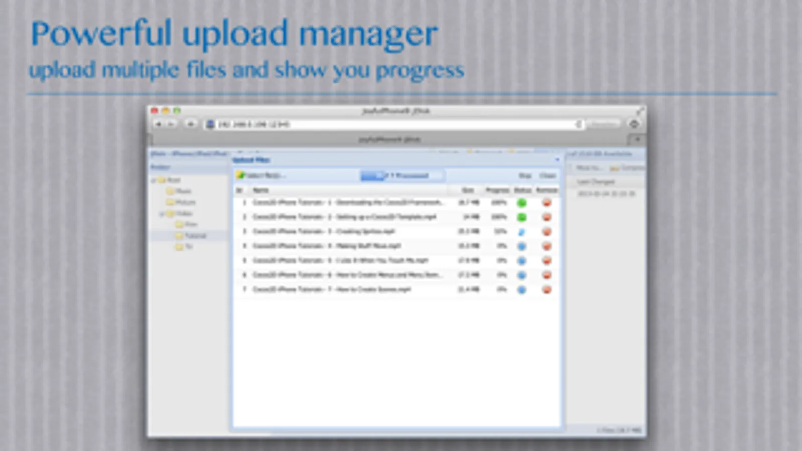 - upload multiple files from your computer to your device, uploading progress is continuously updated to you.