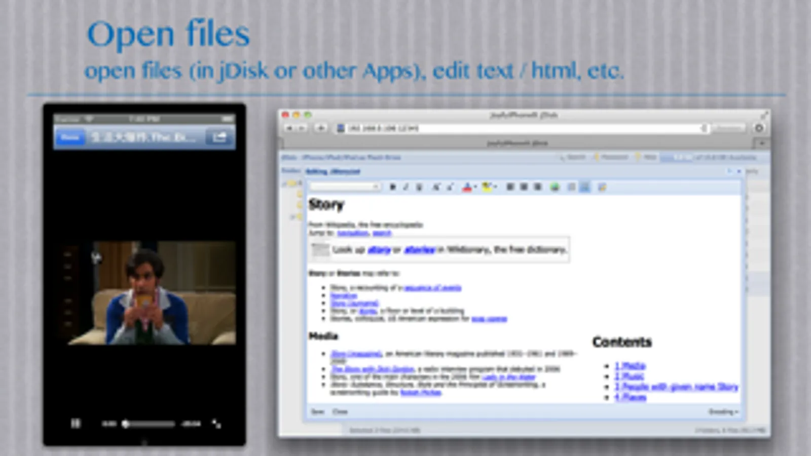 All in all, jDisk empowers your iPhone/iPad, make it work as a moving disk / flash drive. With it you can: