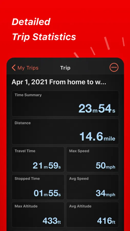 Track important trip statistics in real time. Average and Maximum speed, distance covered, moving and stopped time.