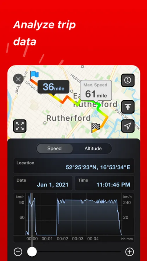 Speed Tracker features unique scalable speedometer dial. Select the maximum possible speed for you vehicle and watch your speed with greater precision either your are on a plain, train, car, bike, boat or bicycle