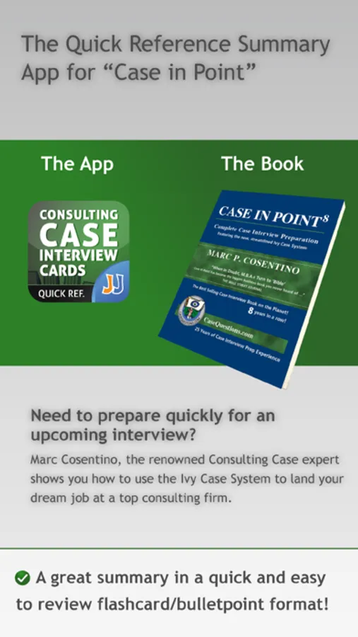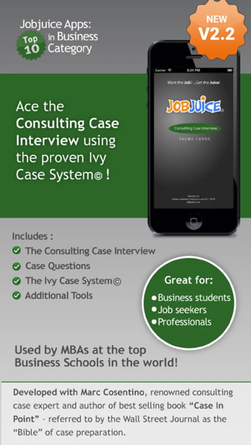 •Developed with Marc Cosentino, renowned consulting case expert and author of best selling “Case In Point” book (referred to by the leading business journal as the “bible” of case preparation)