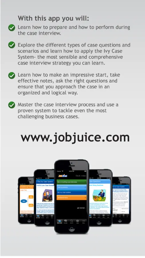 Have a consulting interview coming up soon? Preparing to solve consulting cases doesn’t require complex frameworks or extensive manuals and workbooks. Now you can ace your consulting interview with the easy to use and reference Jobjuice Consulting Case Interview App!