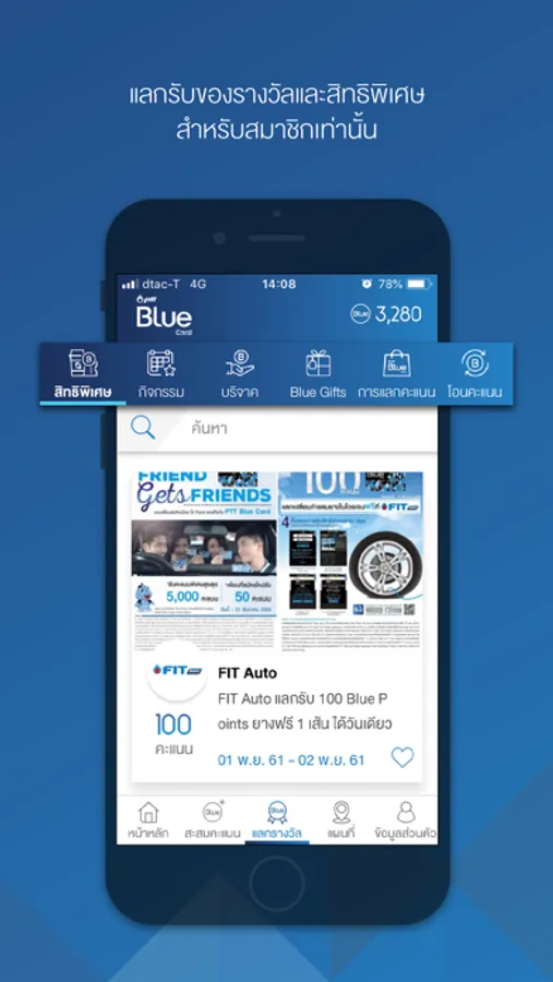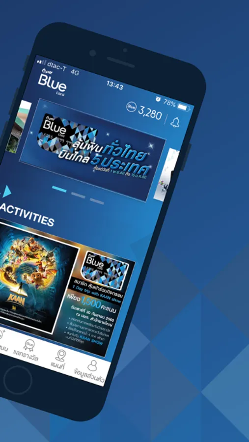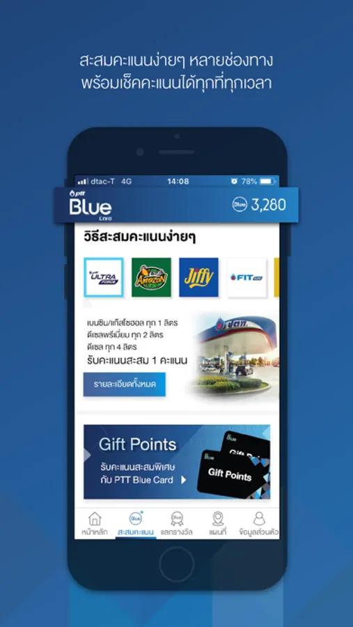Blue Card, a member card that receives reward points from purchasing products/services from PTT Station and participating stores and redeeming points for cash at PTT Station and participating stores as well. Moreover, member can enjoy redeeming points for reward gifts and check balance points at Blue Card Mobile Application