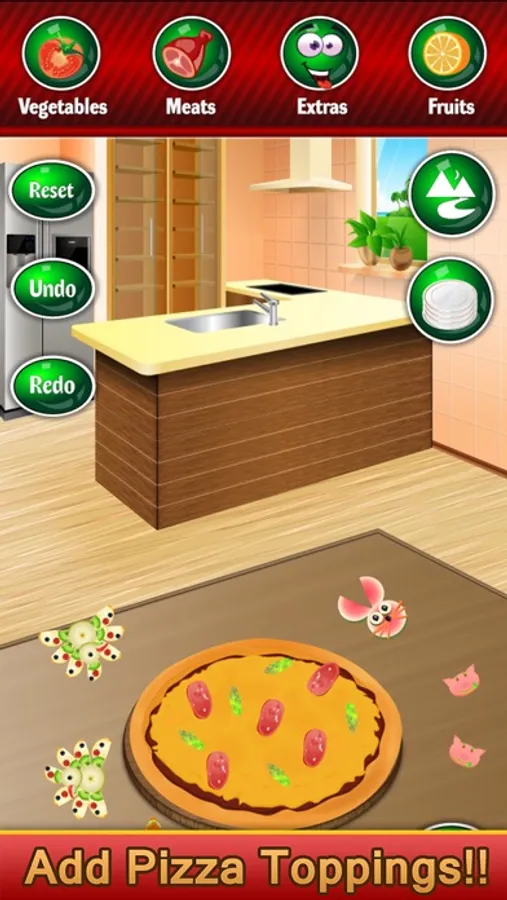 Many combinations possible! Change the background setting and your pizza plates. Save a photo of your best pie & tap to eat the pizza creations!