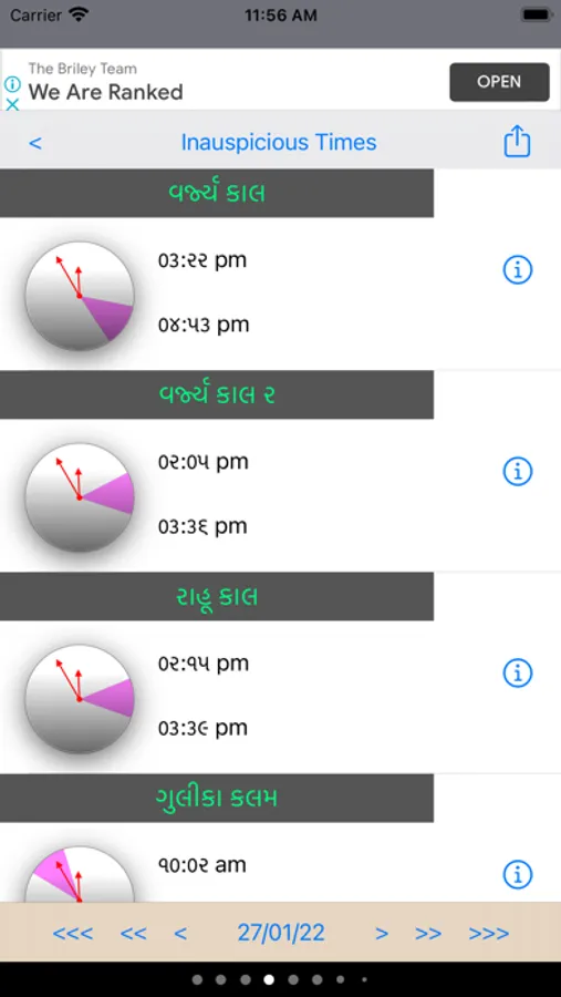 4) Listing of auspicious/inauspicious timings such as Rahu kaal, Amrit kaal, Gulika kaal, YAmagandam, Vajra kaal, Abhijeet etc for each day.