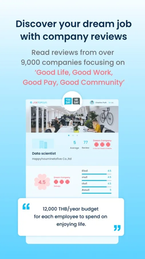 • Discover your dream job with company reviews - Read reviews from over 9,000 companies, focusing on 'Good Life, Good Work, Good Pay, and Good Community'.