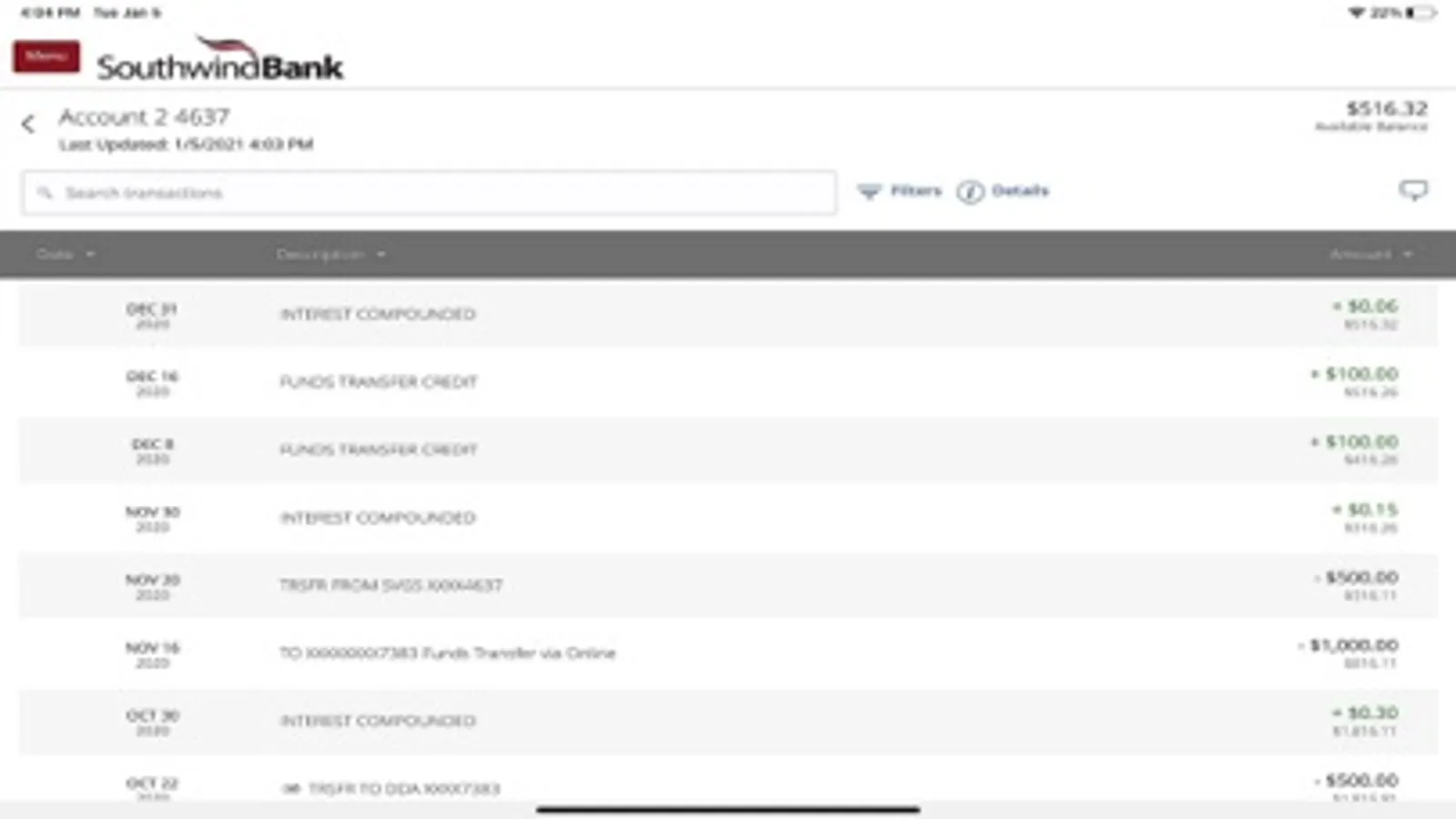 See our Online Banking Agreement and Electronic Funds Transfer Disclosure at http://www.southwindbank.net/default.aspx?v=4e8f6512-4769-42d9-b873-da7cc612b8e1
