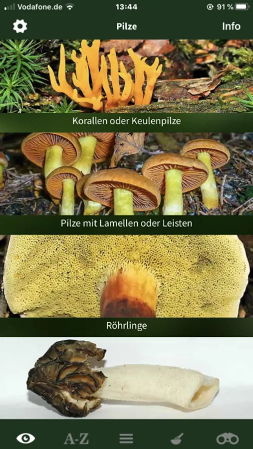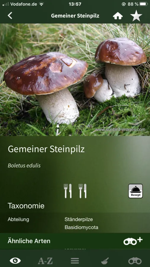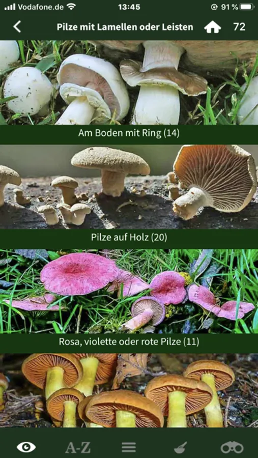 Nach jedem Pilz kann nach deutschem oder wissenschaftlichem Namen gesucht werden. Die Pilze können wahlweise nach Verwandtschaft, Essbarkeit oder alphabetisch sortiert werden.