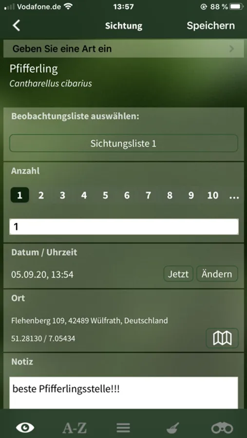 - Gefundene Pilze können mit Standortmarkierung beim Sammeln abgespeichert werden