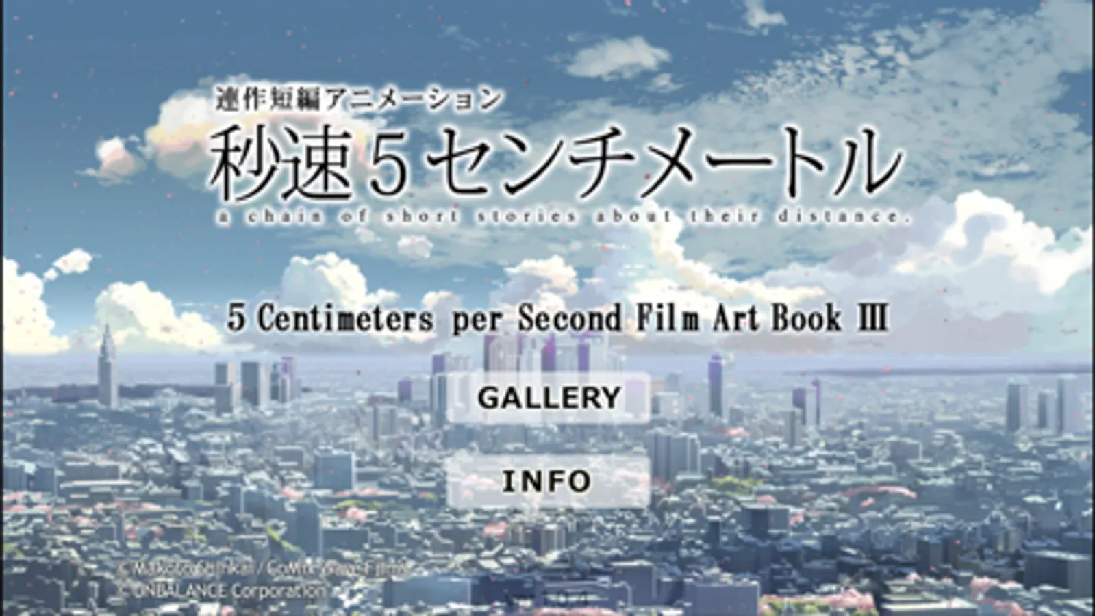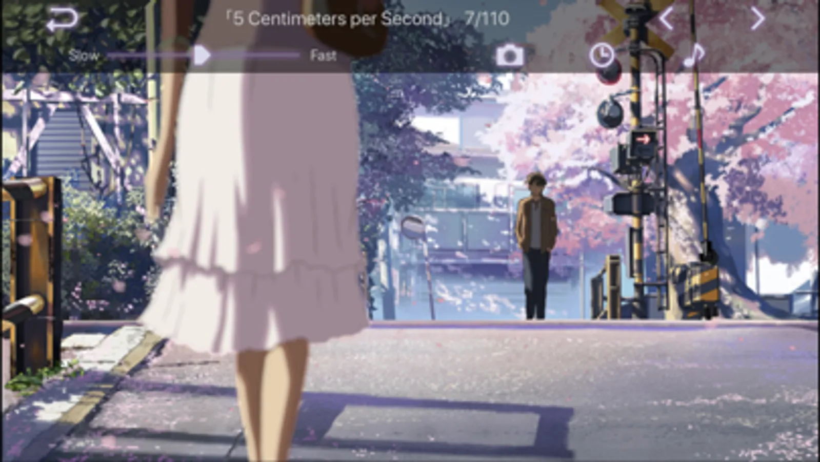 The app contains three songs from 5 Centimeters per Second. Enjoy the pictures with Tenmon’s wonderful works that sets the mood, or also with music in your own library.
