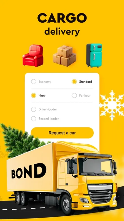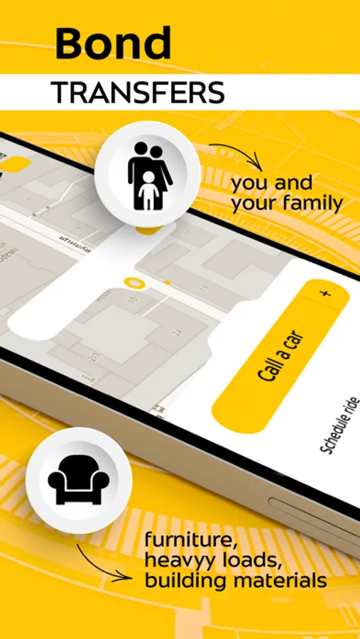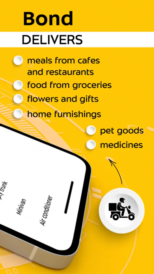 Application to call a taxi "Bond" in Odesa, Kyiv and Chernomorsk, order food delivery in Odesa and Chernomorsk, and cargo taxi in Odesa.