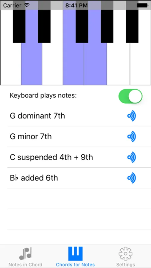 The second mode allows you to highlight notes on a virtual keyboard, while the app lists the chords that contain those notes in an order based on both how well they match and their obscurity. For example, if you select D and F, it is fair to say that D minor is a better fit than A flat diminished 7th, but both are options. Again, this mode lists the notes that make up each of the suggested chords and offers you the chance to listen to them all.