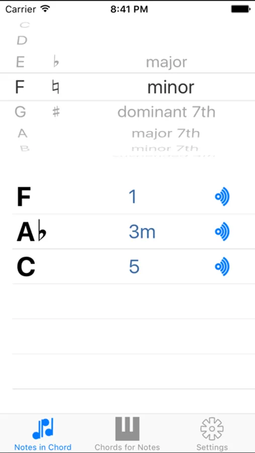 It offers two modes of operation. In the first, you can select a chord and the app will list the notes in that chord, telling you both their names and their degree on the scale. You can also play the chord or individual notes on the built in tone generator.