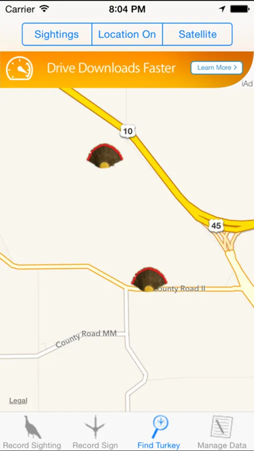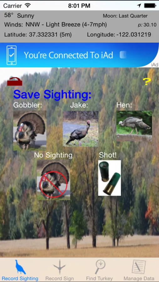 iGoTurkeyHunting is not a game! It is a powerful data capture and analysis tool that allows the turkey hunter to capture turkey sightings, sign and shots with the click of a button. The app automatically captures the type of turkey sighted, weather information, gps coordinates of the sighting, and time/date. This data can be later analyzed for the best spots to hunt given specific conditions and dates. Sightings, sign, and shots can all be displayed on a map.