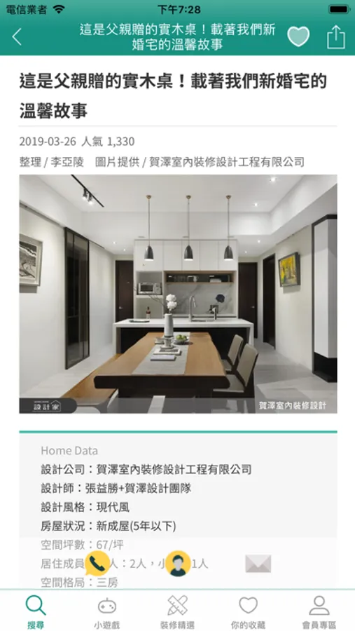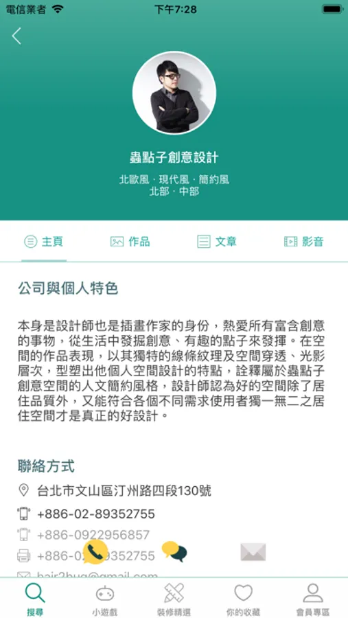 圖片、文章、影音,可以直接撥打電話給喜愛的設計師,直接與設計師聯繫。