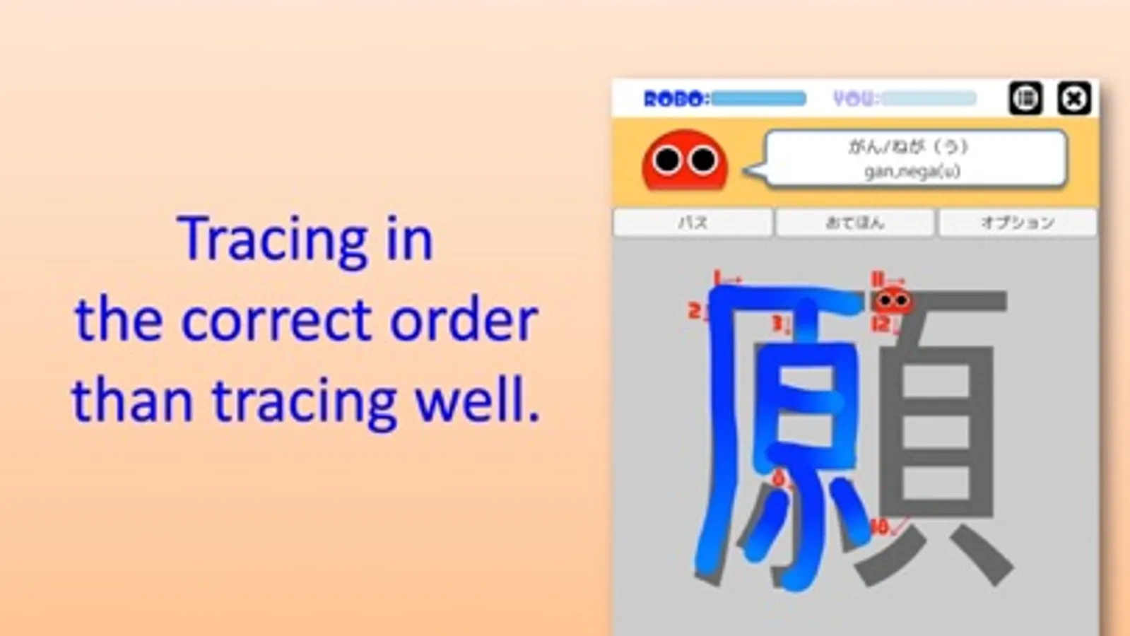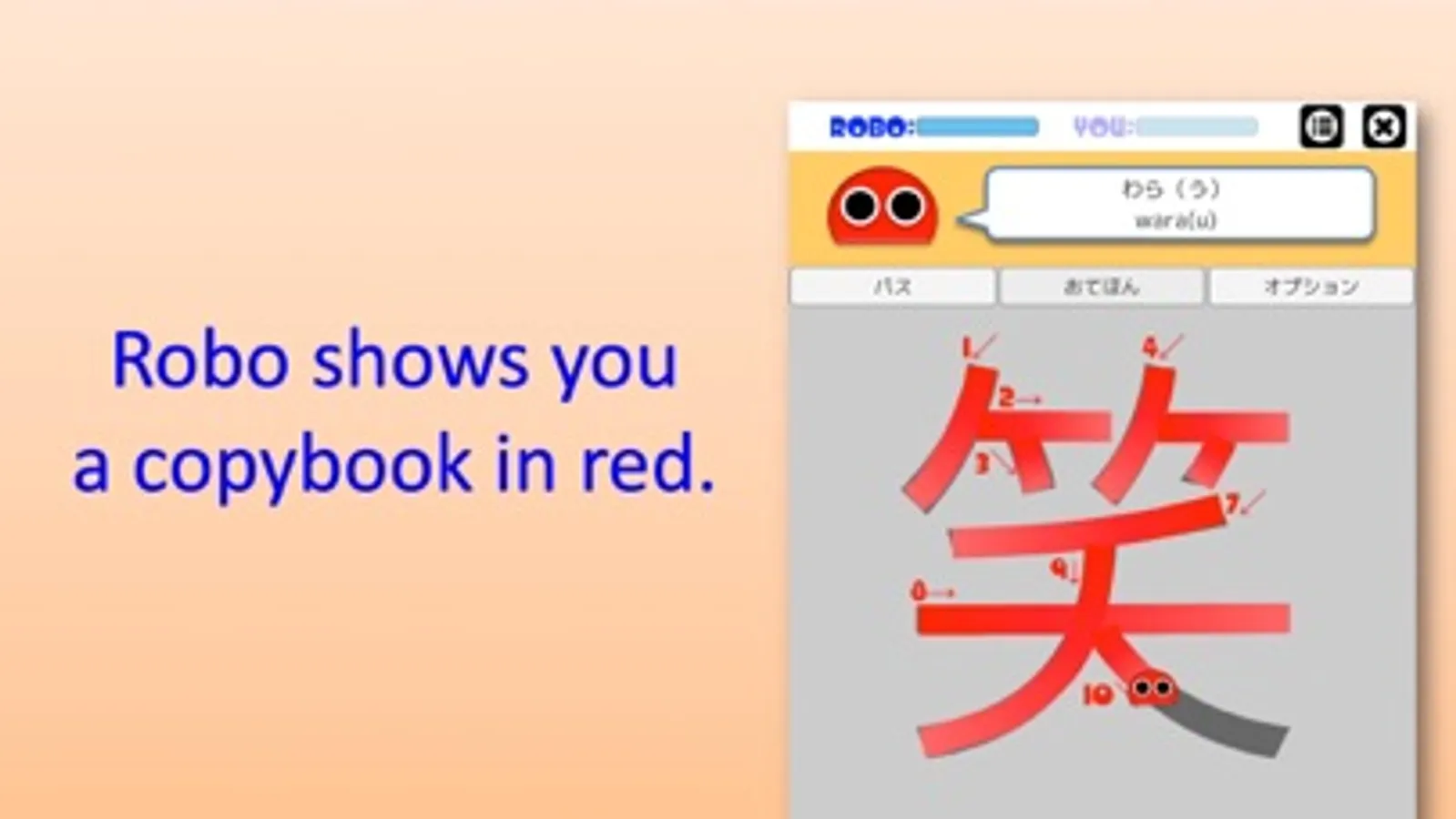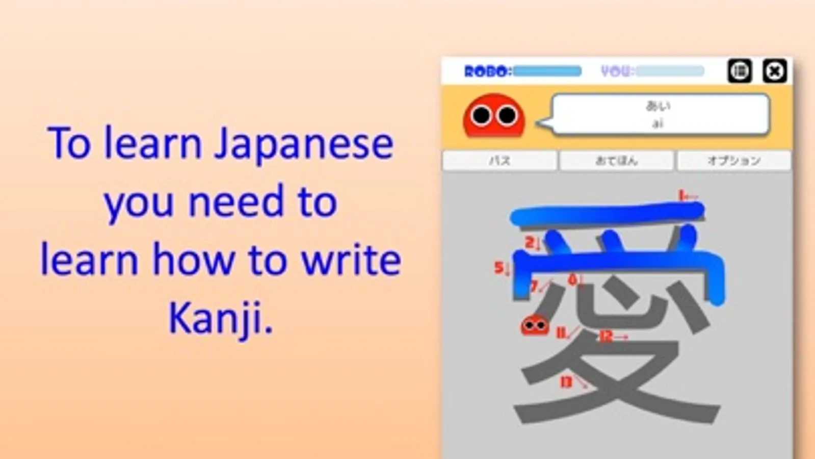 To learn Japanese you need to learn how to write Kanji characters. The best way to learn them is to practice writing them over and over but this can be boring. Instead, have fun and use this game to practice the correct way of writing Kanji - and beat the Robo!