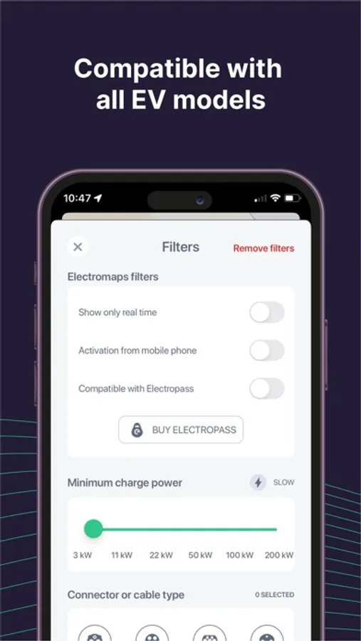 - filter your charging station searches by the speed of charging, connector type, location type, etc.