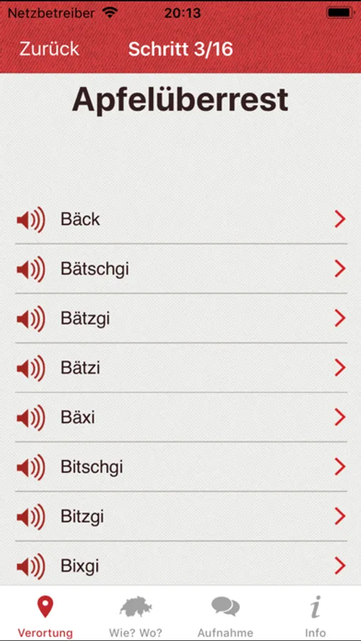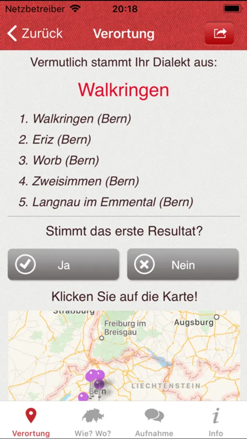 Spuckt die App unerwartete Resultate aus, so kann es sein, dass sich Ihr Ortsdialekt in den letzten 100 Jahren weiterentwickelt hat – und/oder Sie sprechen durch Ihre Mobilität etc. bestimmte Wörter anders aus, als sie in Ihrer Region noch vor 100 Jahren ausgesprochen wurden