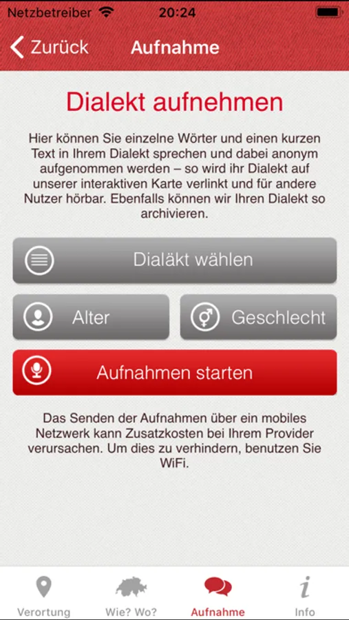 Die kostenlose Dialäkt Äpp erlaubt eine geographische Lokalisierung Ihres Schweizer Dialekts nach sprachwissenschaftlichen Standards. Sie können ihren Dialekt aufnehmen und die Dialekte anderer Benutzer sowie historische Aufnahmen des Phonogrammarchivs der Universität Zürch anhand einer interaktiven Karte anhören. Gleichzeitig erlaubt es die Dialäkt Äpp, zeitgenössische Schweizer Dialekte als wertvolles kulturelles Gut zu archivieren. Weiter erhalten Sie auf Wunsch einmal pro Woche das spannende Informationen zum Dialektwort der Woche, die das Schweizerdeutsche Wörterbuch (Idiotikon) freundlicherweise zur Verfügung stellt.