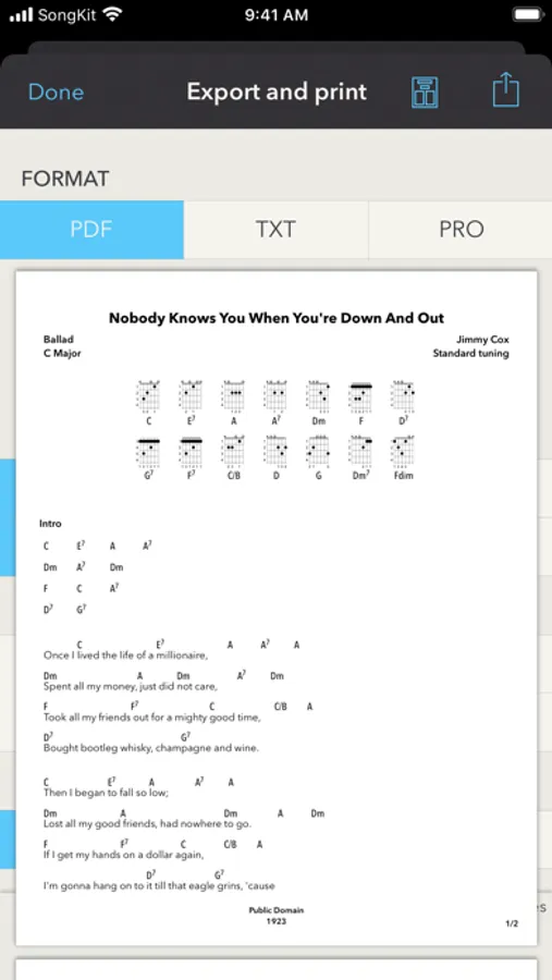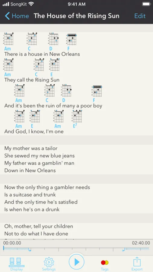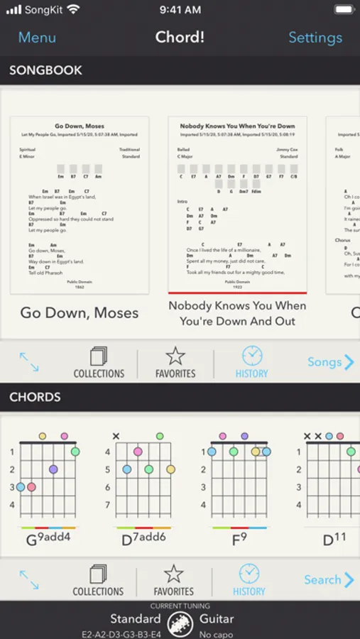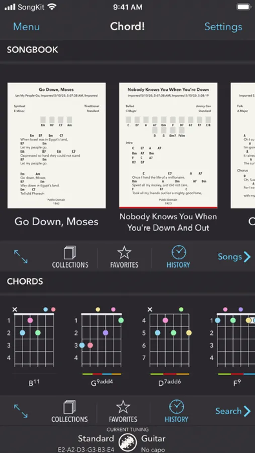 You can also import your existing songs in text format (please note that the app does not ship with songs). You can also link audio tracks from your music library and play them at the same time while adjusting their pitch and/or speed.