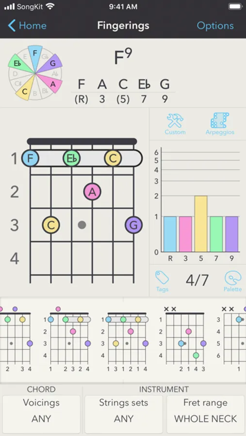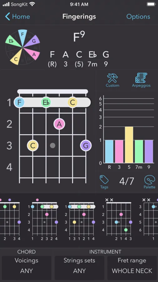 The app uses custom and unique algorithms to generate charts, easily input complex harmonic structures, extract chords from fingerings, determine finger positions, compute keys of scales, generate chords from scales and find scales that go well with some chords.