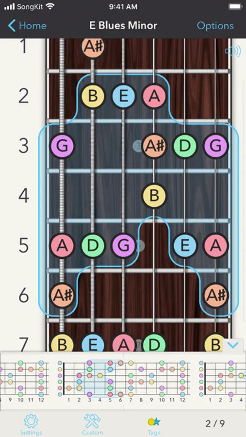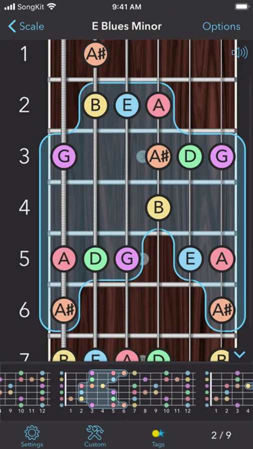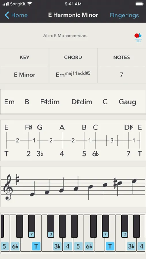 The app also ships with the biggest list of named scales (and you can create your own scales). It analyses and presents them with nice interactive views (scale, score, and keyboard). Of course, it can also lay down these scales on a neck (with sound) and compute their fingerings. Like for chords, you can even search for a scale from its fingering!