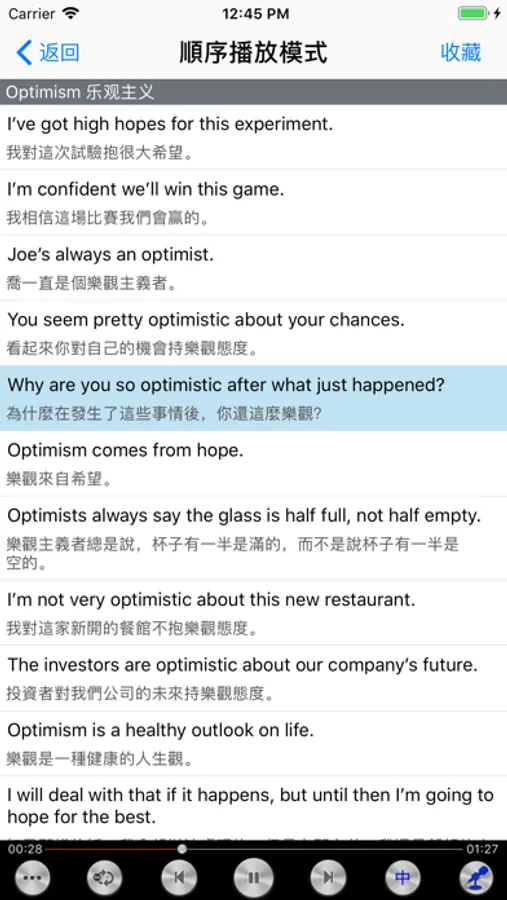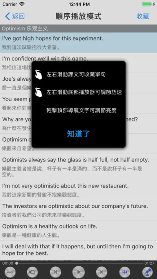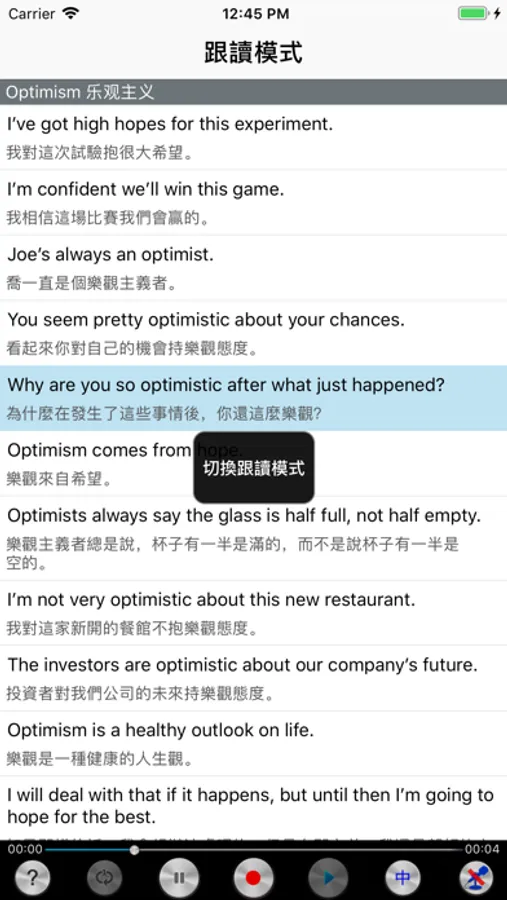 3、多种播放模式选择:单句循环、单课循环、课程连播、对比播放、是否显示中文译文播放等等,适合各种学习模式,能帮你迅速提升英文听力能力