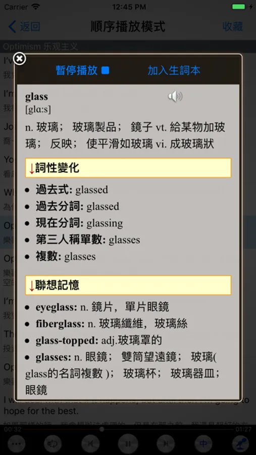 5、单词长按显示词典查询功能:学习课文中遇见不熟悉的单词,手指长按在上面即可显示单词释义,并可随时加入生词本,真正做到哪里不懂点哪里