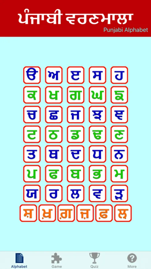 For kids and beginners of Punjabi and Gurmukhi! Learn the letters of the Punjabi Alphabet, hear the pronunciation, practice writing, test your knowledge.