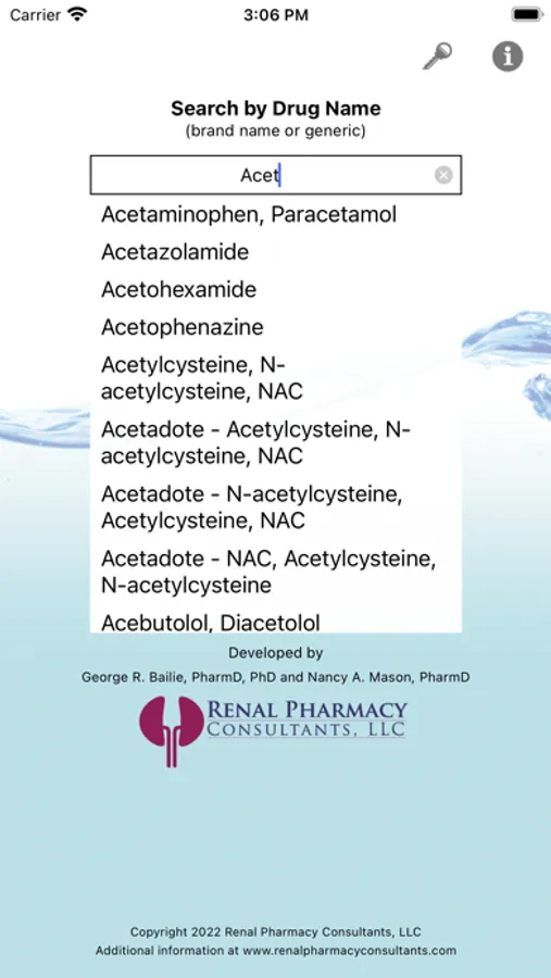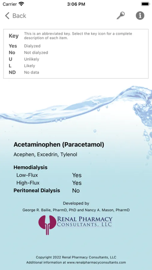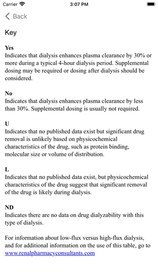 Users of this application are referred to www.renalpharmacyconsultants.com for background and explanatory material to assist in the interpretation of the tabular data. The website provides specific information about factors that influence drug dialyzability and special considerations, such as CRRT, plasmapheresis and drugs of abuse. Users must be familiar with this information prior to using the content of this application. The website also includes a table presenting sieving coefficient data from in vitro and in vivo evaluations, which can be used to predict dosing requirements in CRRT, and a table regarding removal of drugs of abuse.