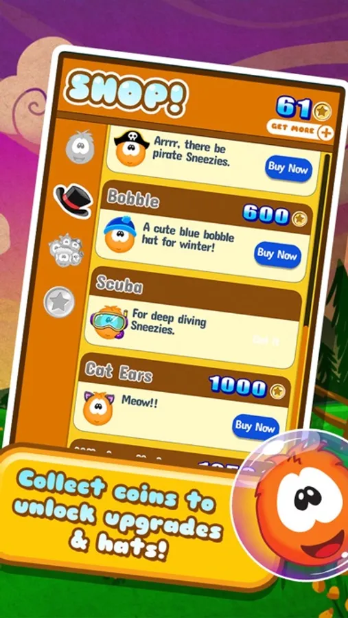 You can also collect coins as you play, and use them to upgrade your game, or to buy cool accessories for your Sneezies.