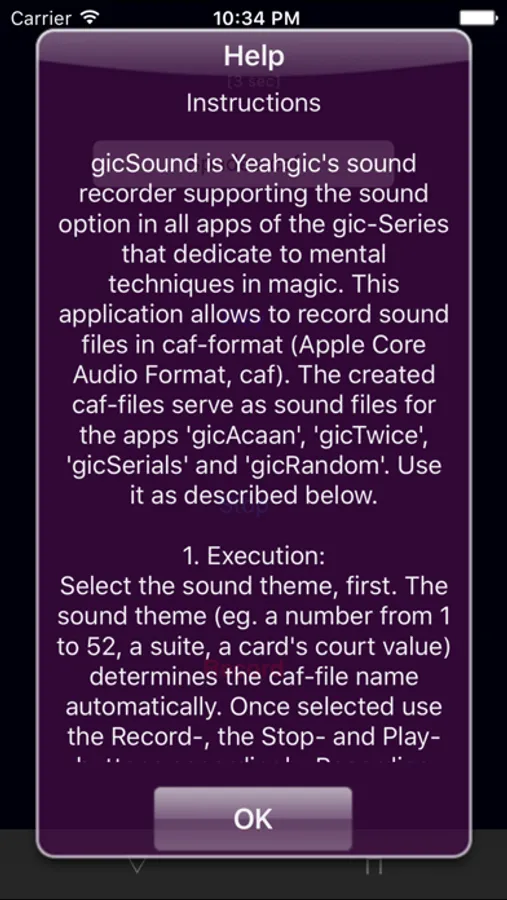 Random Sound Recorder is Yeahgic's sound recorder supporting the sound option in all apps of the gic-Series that dedicate to technical learning tools for close up magicians. This application allows to record sound files in caf-format (Apple Core Audio Format, caf) according to the four suites, the ace, the three court cards and values from 2 to 9. Also all numbers to allow for 52 positions can be recorded. The created caf-files serve as sound files for the apps 'gicAcaan', 'gicTwice', 'gicSerials' and 'gicRandom'. Once recorded, using iTunes, the sound files can be moved to their final destination in the other apps' documents folder.
