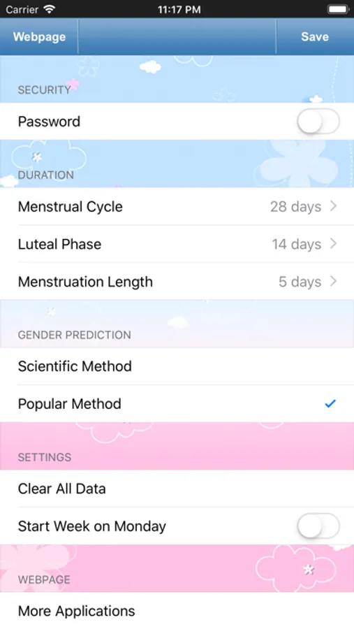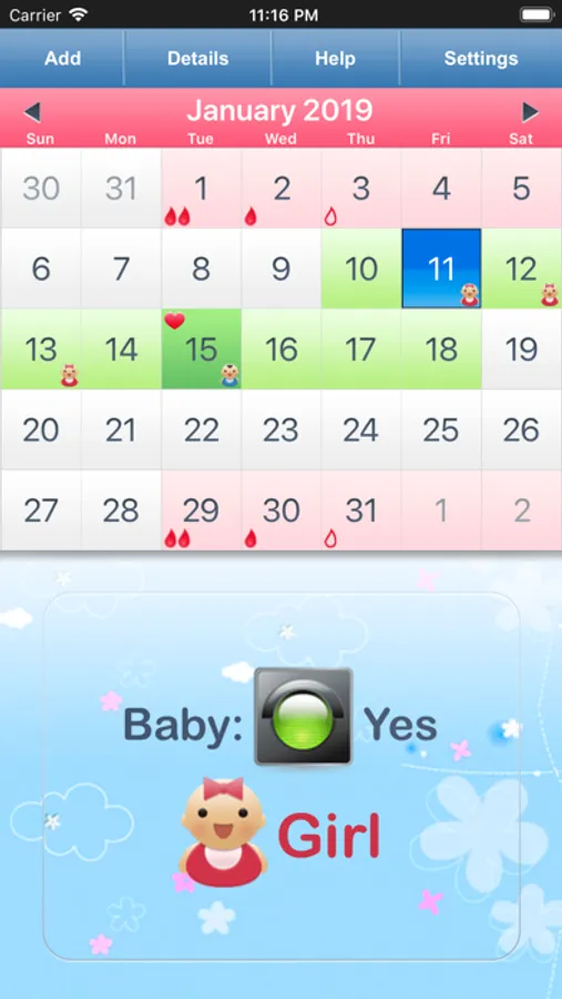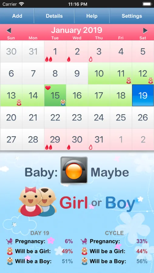 You can change the gender prediction method on the “Settings” screen. But remember that either gender prediction method shows only slightly higher chances of conceiving a girl or a boy and it never guarantees the result.