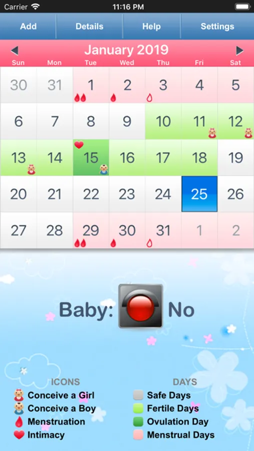 The application is based on the scientific research. It helps to determine the fertile days of the month, so you can either achieve or avoid pregnancy. The application uses the date of the last period and shows the date of the next period, the best days to conceive a baby, the ovulation day and when you can avoid pregnancy.