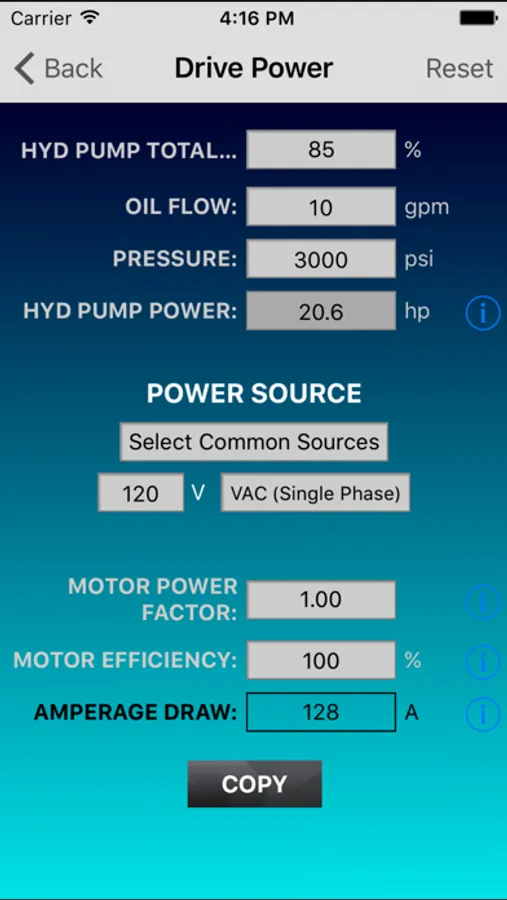 The user can then select or enter custom power source specifications (Voltage, Single/3 Phase, Power Factor, Motor Efficiency) to determine the amperage draw required.