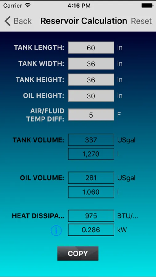 Reservoir design page includes calculations for tank size, oil volume and heat dissipation. Values are entered in either metric or imperial units. Results are shown for both metric and imperial.