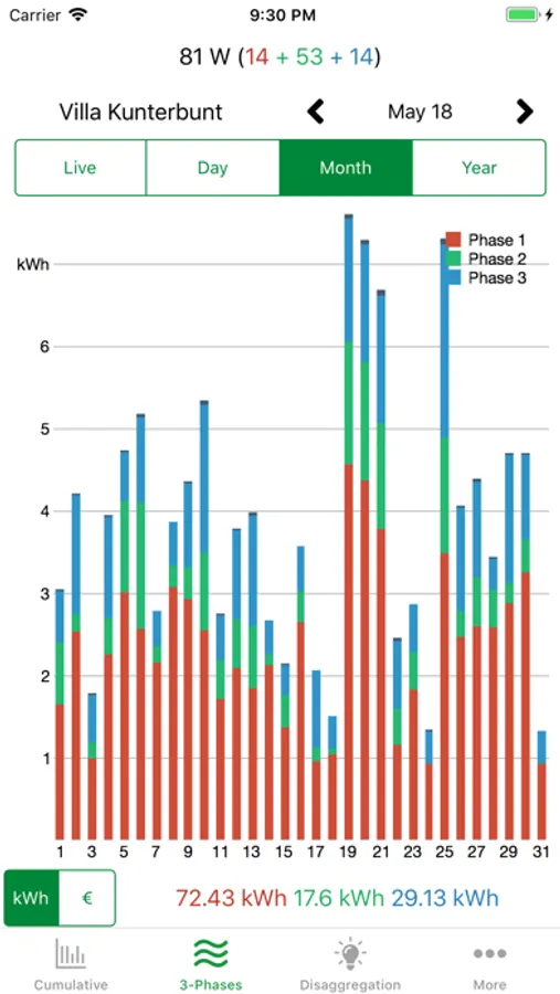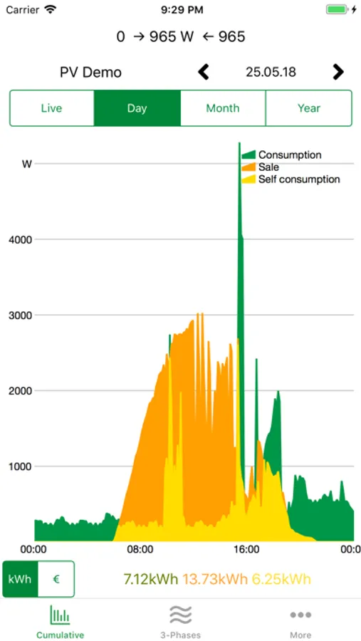 With the new Discovergy app you have access to all the information about your power consumption and production at your finger tips. Along with the live readings you can also get an overview of your daily, monthly and yearly power data.